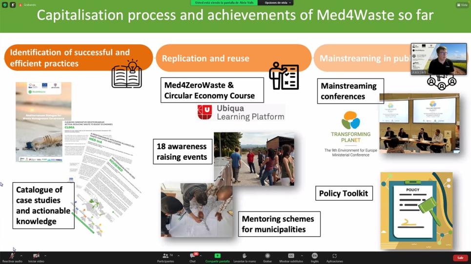Por su parte, Aleix Valls, del CT BETA, ha hablado de algunas de las actividades específicas que se están llevando a cabo desde el Med4Waste, sobre todo del curso online sobre gestión de residuos y prácticas de economía circular que se ha realizado desarrollado con el apoyo de la Fundación Rezero y que pronto estará disponible en Ubiqua.
